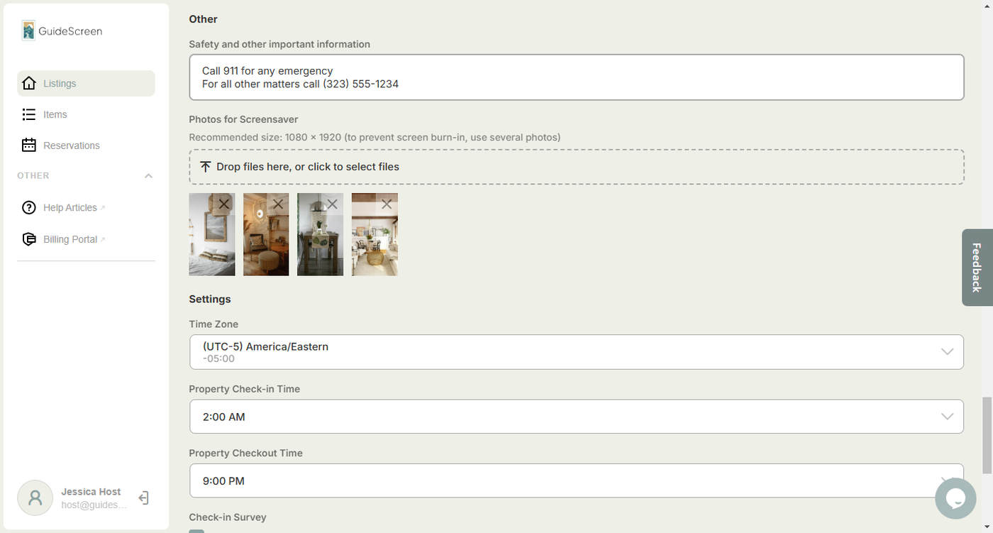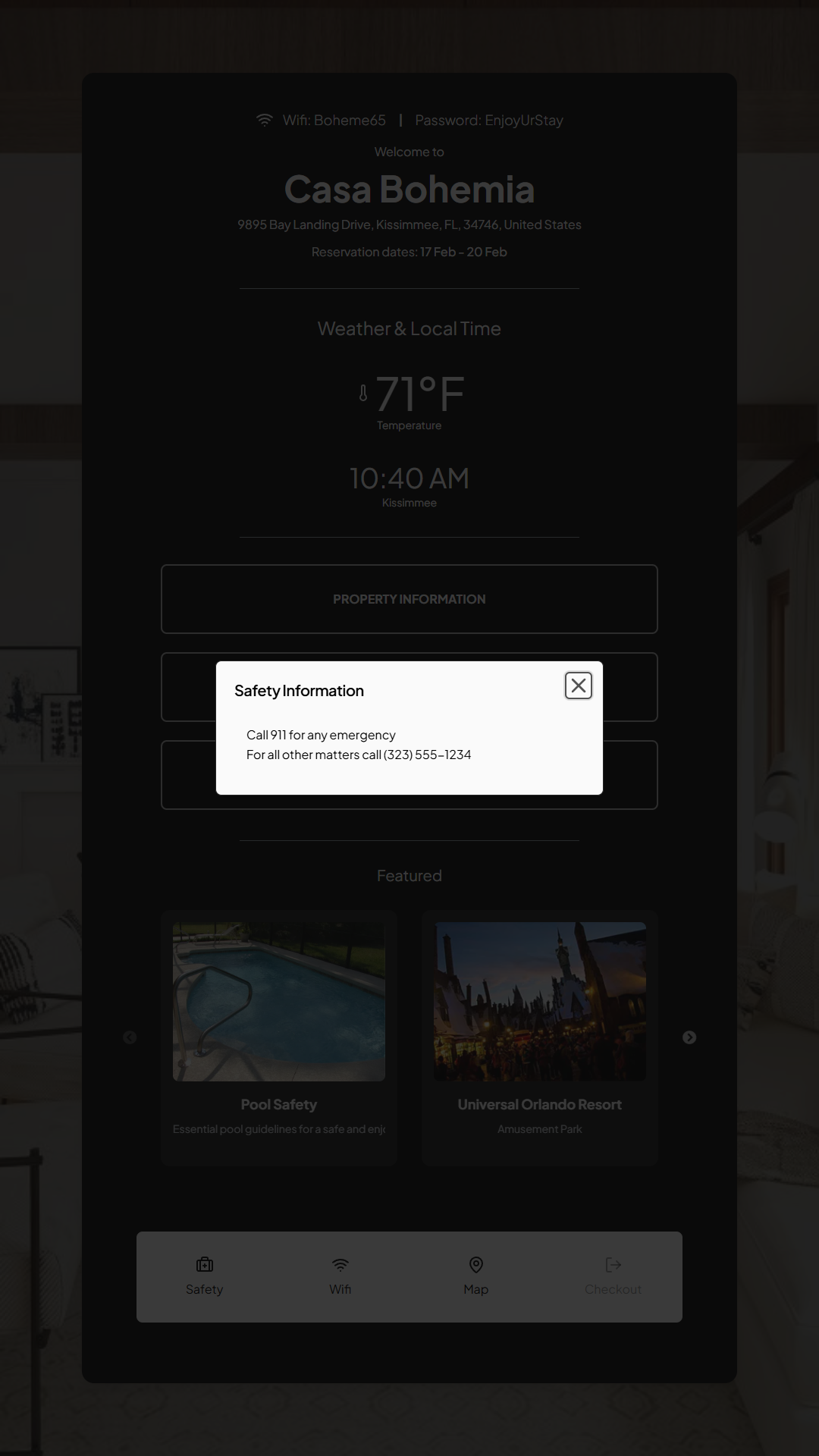 1. Safety and other important information - This is where you put safety and other important information like the number for the police department, fire department etc. and reminders to your guests. The info is shown when the guest taps on the safety icon in the bottom navigation.