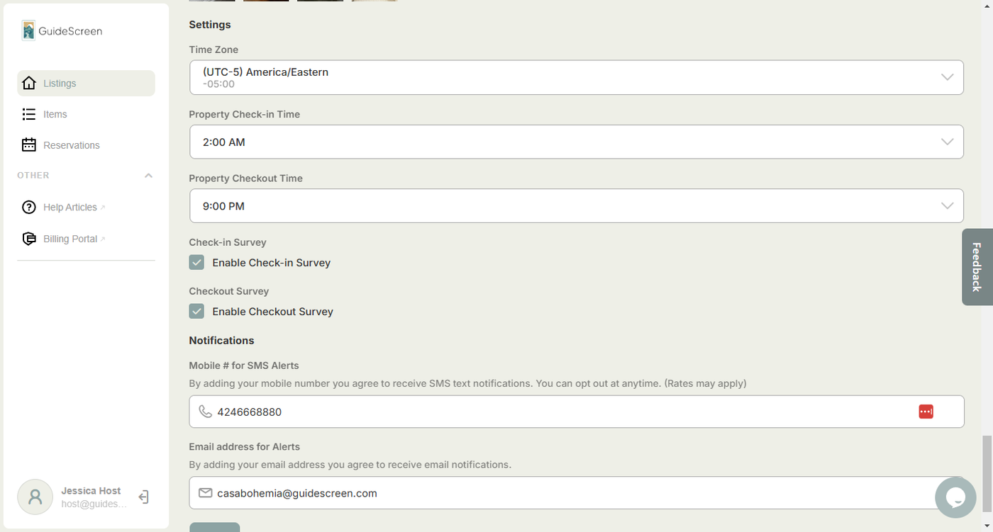 The Settings Section is where you configure the time zone and check-in and checkout times of your property.