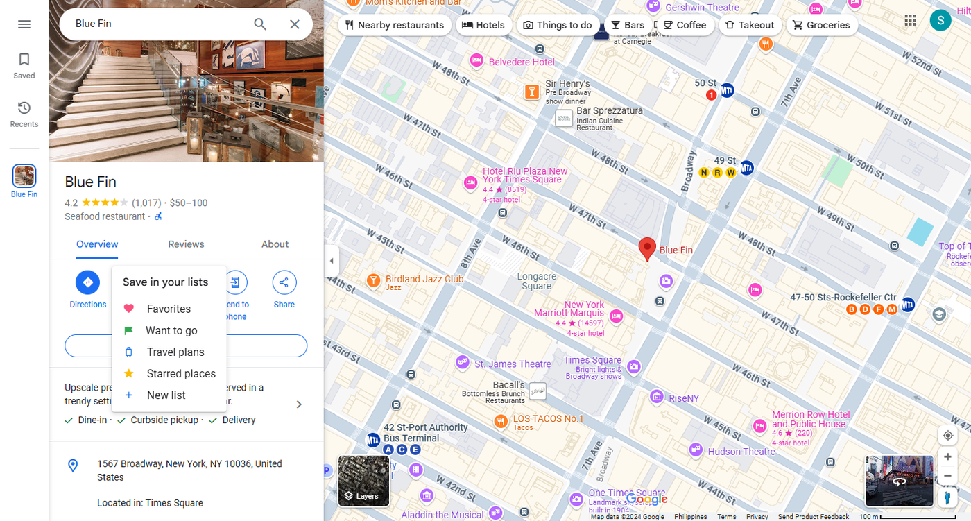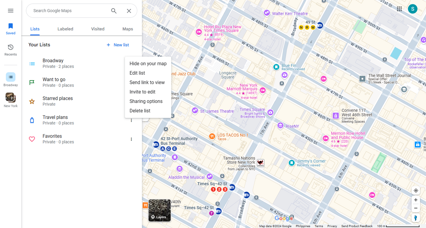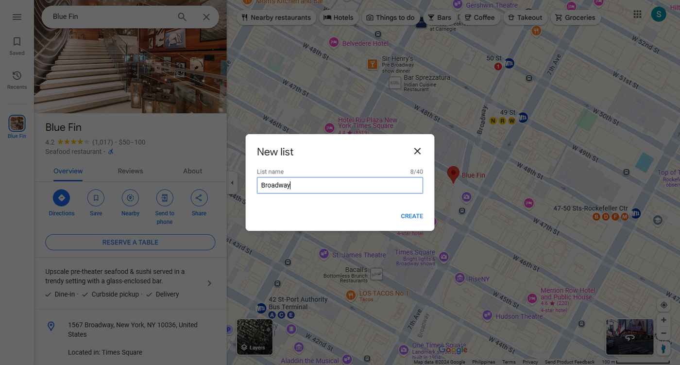 2. An info section will appear on the left if the location is already added in Google Maps. If the info appears, click the "Save" icon. A menu will appear. Select + "New List" and then name the list based on how you curated your list. Add more items to your list by using the search bar.