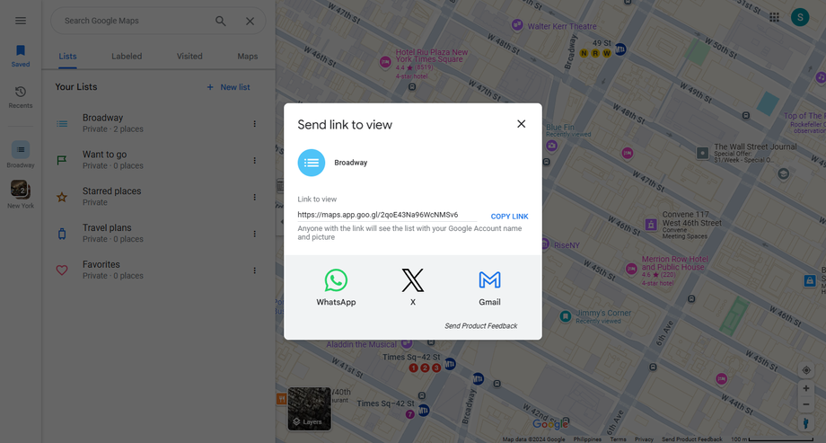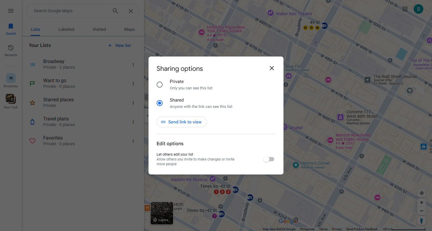 3. Once you're done with your list, click "Saved" on the sidebar. It would show you the list you just saved in the previous step. Click on the skewer icon to the right of the list. Options should appear. Select either "Send link to view" or "Sharing options".