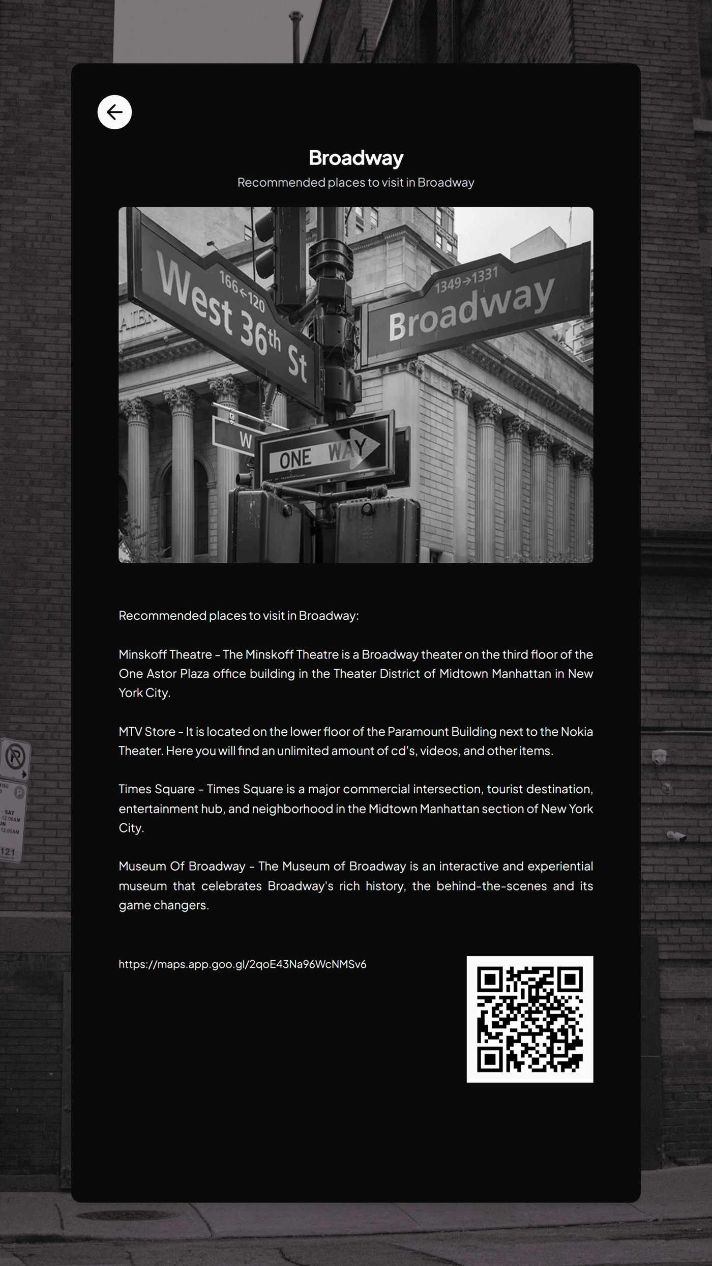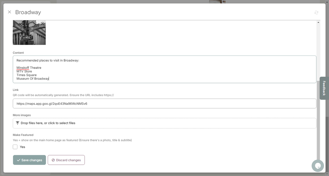 Paste the link you got from Google Maps on the Link field of your item. The link will be displayed, together with the generated QR code. Guests will now have the ability to scan the QR code and save the locations from your map to their devices.